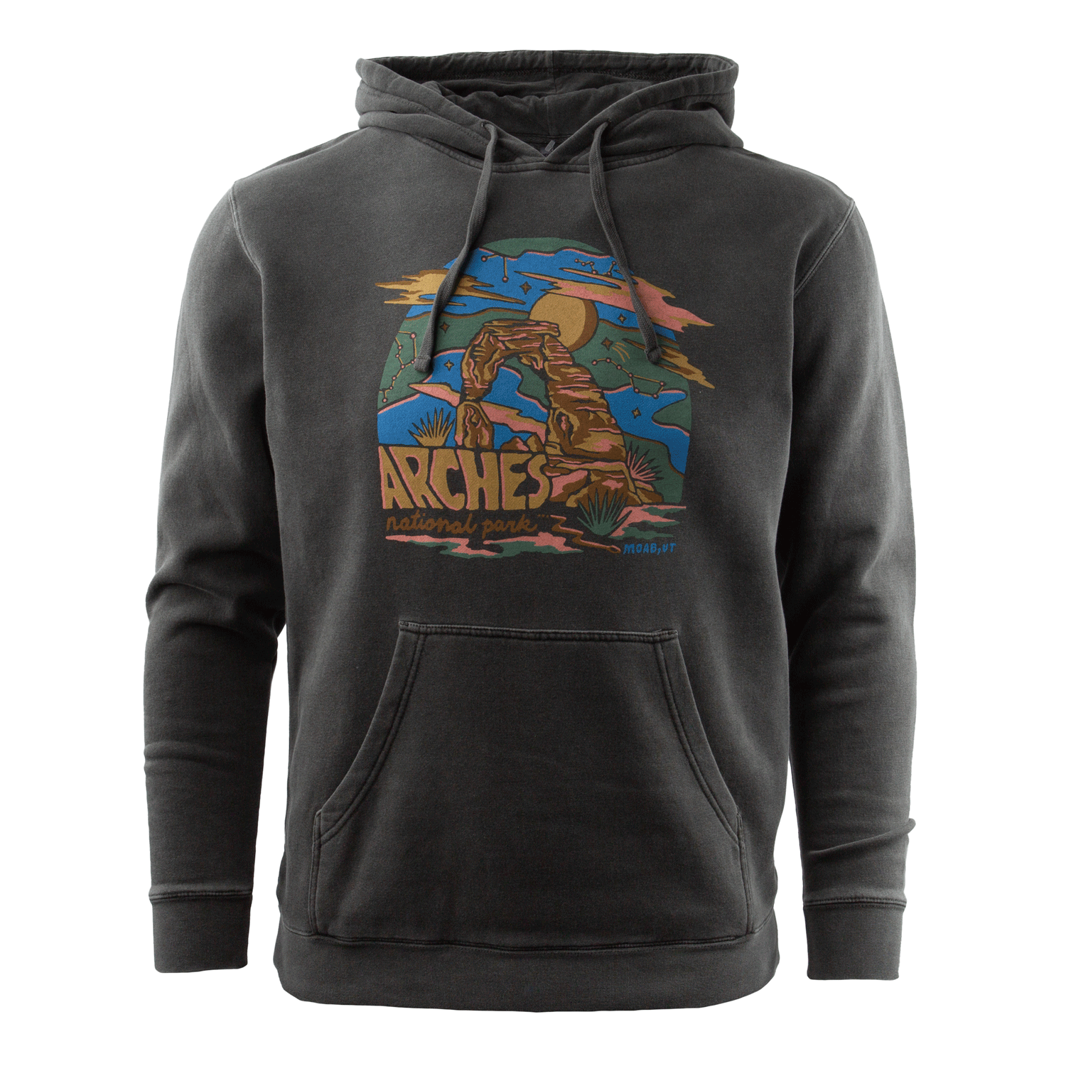 Bold and artistic, this hoodie features a vivid take on Delicate Arch set beneath a colorful desert night sky filled with stars and layered, flowing hues. The design blends classic Moab scenery with a more imaginative, almost dreamlike style, making it a true standout piece.